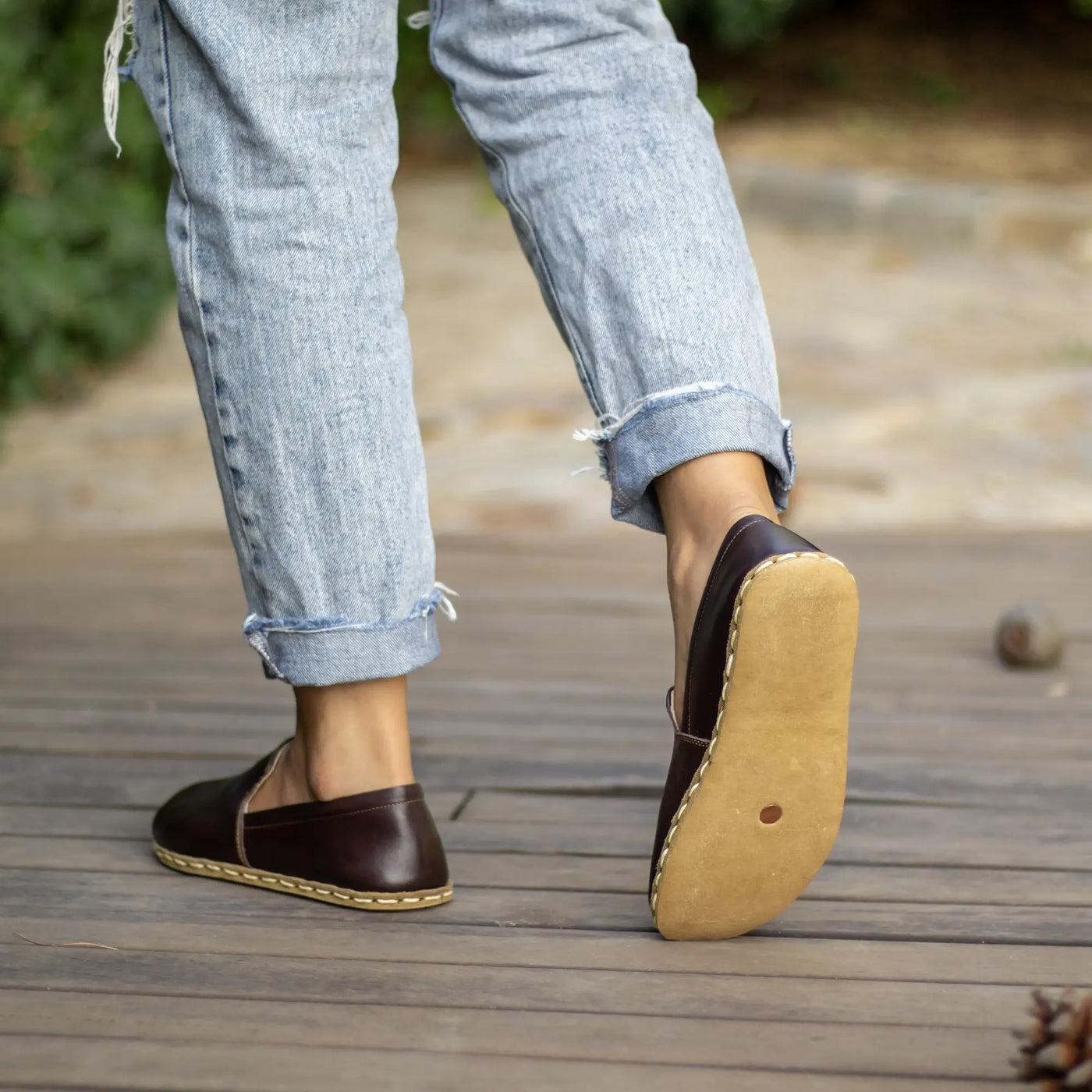Buffalo leather-soled, handmade, zero-drop barefoot shoes. Sole thickness 5–8 mm, weight 250–400 g. No synthetic or vegan leather; made entirely from genuine natural leather. Lasts more than 2 years. Care: wipe with a damp cloth, do not machine wash, avoid excessive water exposure.