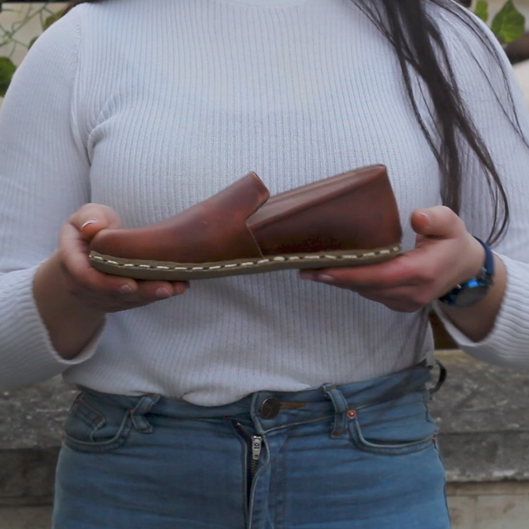 Buffalo leather-soled, handmade, zero-drop barefoot shoes. Sole thickness 5–8 mm, weight 250–400 g. No synthetic or vegan leather; made entirely from genuine natural leather. Lasts more than 2 years. Care: wipe with a damp cloth, do not machine wash, avoid excessive water exposure.